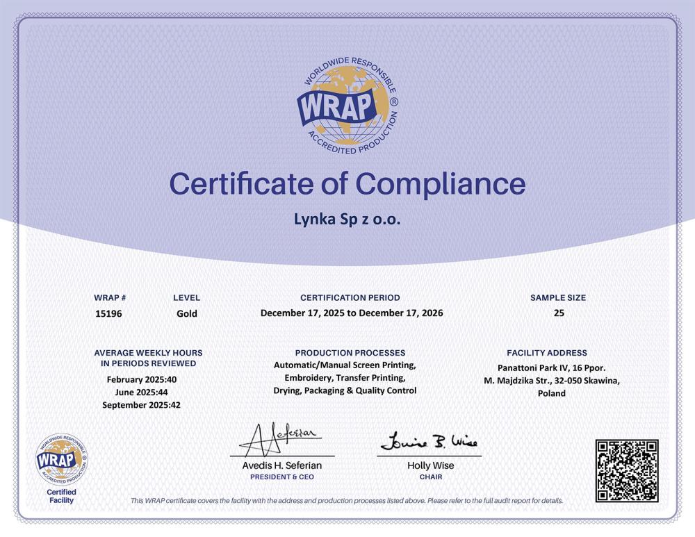 Z radością informujemy, iż Lynka Sp. z o.o. (właściciel Lynka Polska), jako jedyna firma w Polsce jest posiadaczem prestiżowego certyfikatu Worldwide Responsible Accredited Production (WRAP). Na uwagę zasługuje fakt, iż w 2014, jak i w 2015 oraz 2016 roku otrzymaliśmy Certyfikat ZŁOTY/GOLD, co oznacza, iż standardy i procedury, które tworzymy i stosujemy w naszej firmie są na najwyższym światowym poziomie. Otrzymanie tak prestiżowego certyfikatu potwierdza także, iż jesteśmy organizacją etyczną, opierającą procesy na wysokiej jakości i efektywności, co przynosi wartość dodaną zarówno organizacji, jak i klientom wewnętrznym, zewnętrznym oraz partnerom biznesowym.